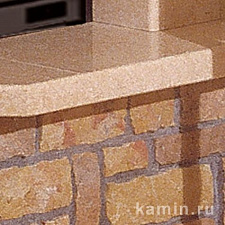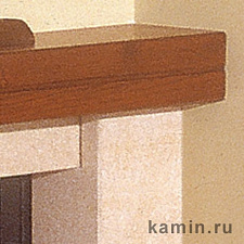 Угловая облицовка, боковые детали и цоколь которой выполнены из желтого мрамора istria, с горизонтальными прорезями. Плита из полированного коричневого стонелита, балка из натурального дерева.